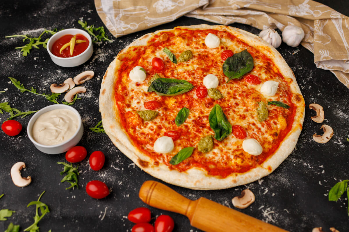 Aluat, sos pizza, mozzarela, mozzarela bilute, rosii, busuioc frunze, sos pesto, greutate – 500g