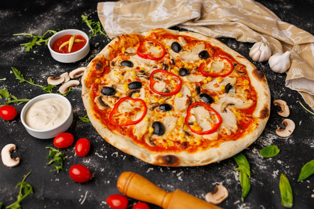 Aluat, sos pizza, mozzarela, piept de pui (pastrama), ciuperci, kapia, masline, porumb, greutate – 570g