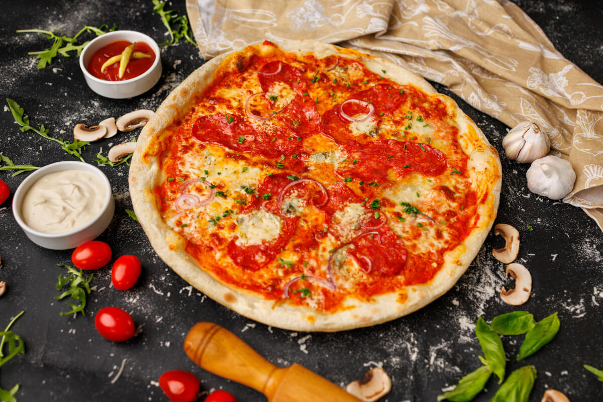 Aluat, sos pizza, mozzarela, salam picant, ceapa rosie, gorgonzola, greutate – 500g