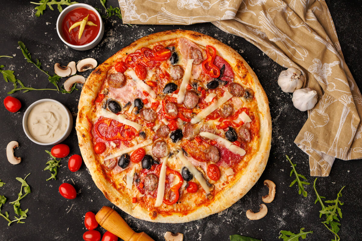 Aluat, sos pizza, mozzarela, sunca, salam, carnati, ciuperci, rosii, masline, kapia, greutate – 600g