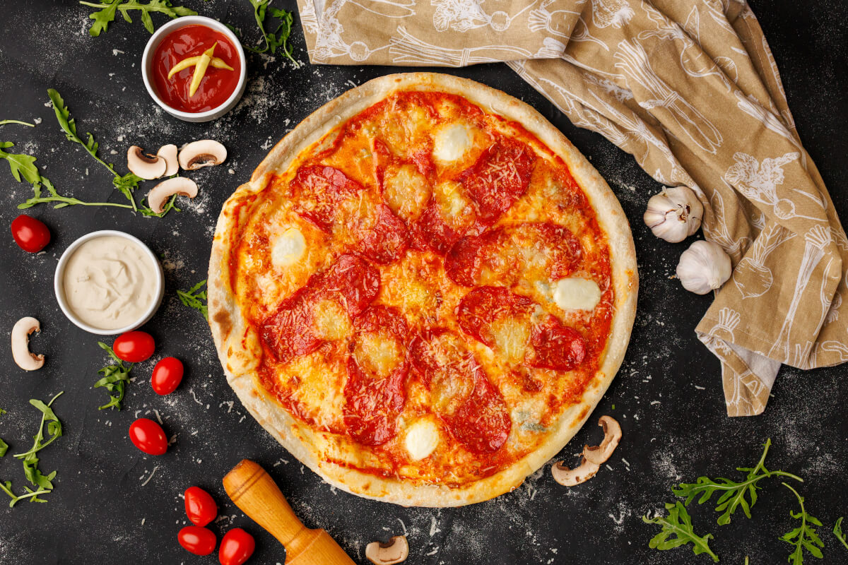Aluat, sos pizza, mozzarela, gorgonzola, brie, parmezan, rosii, salam picant, greutate – 580g